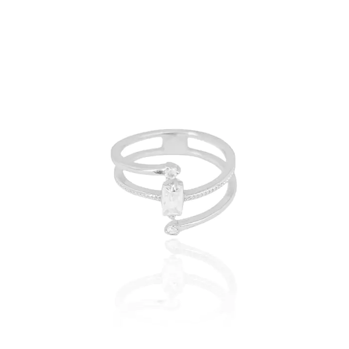 Anel Três Filetes Liso e Riscado Pontos de Luz Cristal Tamanho 13 Banho Branco
