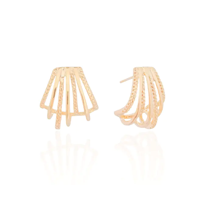 Brinco Meia Argola Filetes Lisos e Detalhados Banho Dourado