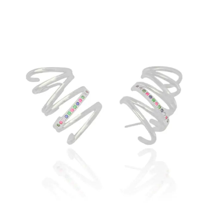 Ear Cuff Duplo Filetes Colorido Cravejado Banho Branco