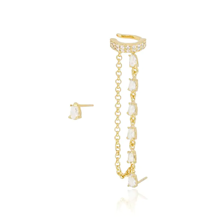 Ear Line Gota Piercing Cravejado Cristal Corrente Portuguesa Banho Dourado