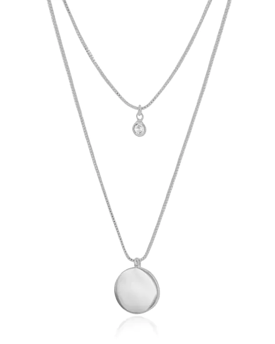 Gargantilha Dupla Pingente Redondo e Ponto de Luz Cristal Banho Branco - 40/50 cm