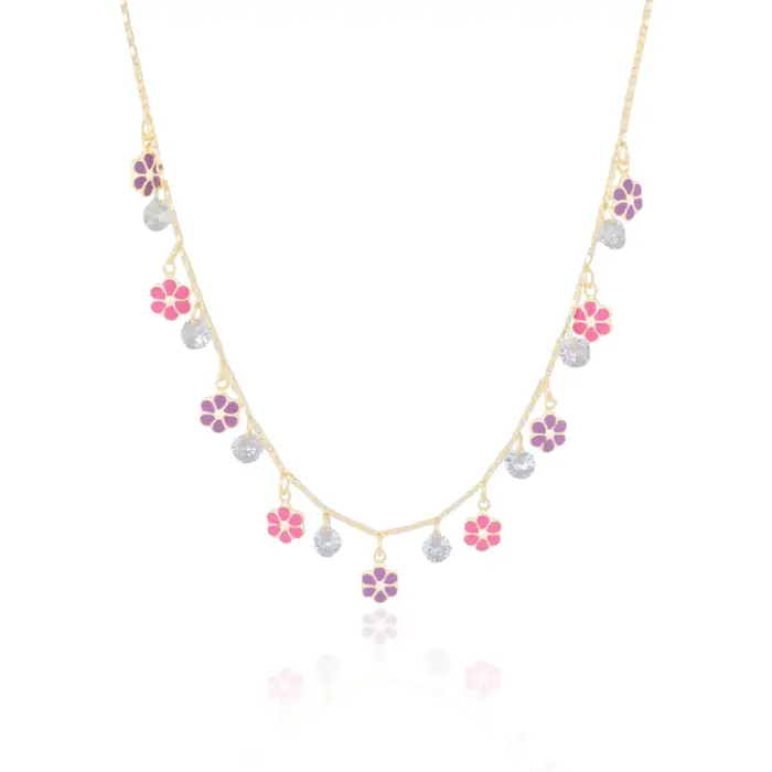 Gargantilha Infantil Flores Coloridas e Pontos de Luz Cristal Banho Dourado