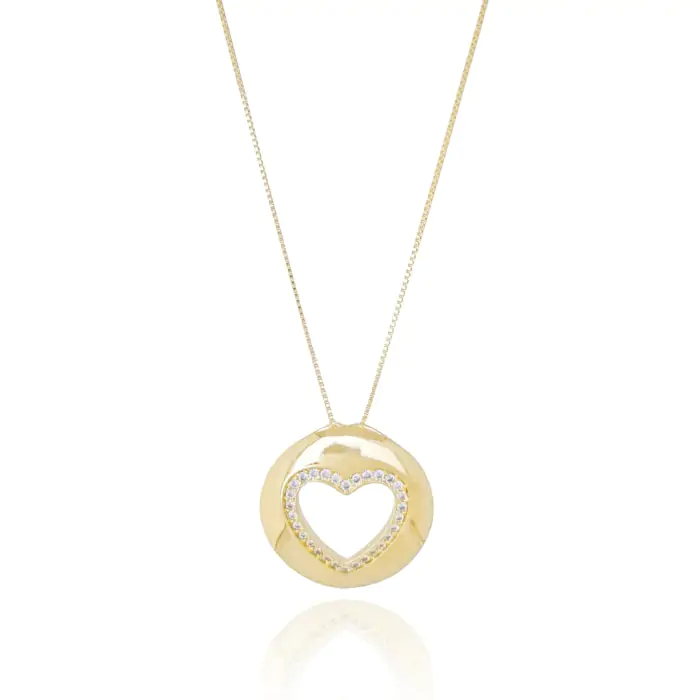 Gargantilha Pingente Redondo Coração Vazado Cravejado Cristal Banho Dourado