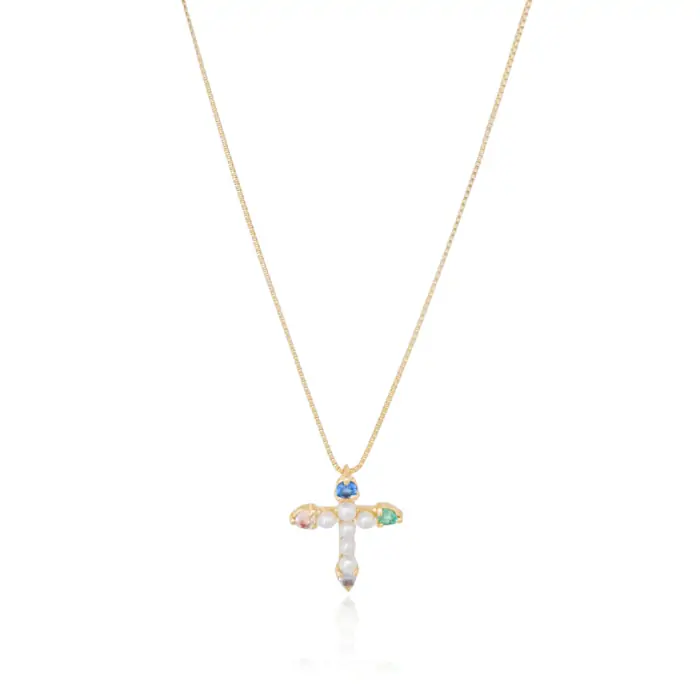 Gargantilha Veneziana Cruz Perolas Pontos de Luz Coloridos Banho Dourado