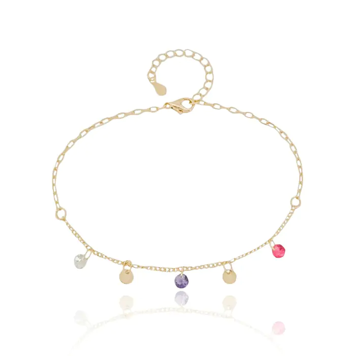 Tornozeleira Pontos de Luz Coloridos Plaquinhas Flat Redondas Banho Dourado